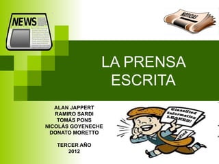El documento habla sobre la prensa escrita. Explica que se refiere a publicaciones impresas que se diferencian por su periodicidad, desde diarios hasta publicaciones anuales. También describe los objetivos de la prensa como informar, promover, opinar, entretener y persuadir. Brevemente resume la historia de la prensa escrita y los tipos según temática y frecuencia, así como aspectos como precio, público objetivo, construcción de noticias y estilos periodísticos.