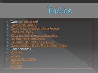 Este documento describe los conceptos básicos de la neumática, incluyendo que la neumática utiliza el aire comprimido para transmitir energía, las ventajas de las prensas neumáticas como requerir menos mantenimiento que las hidráulicas, y los componentes clave como válvulas, cilindros y tuberías.