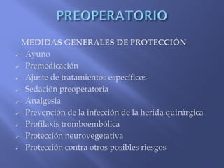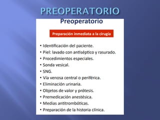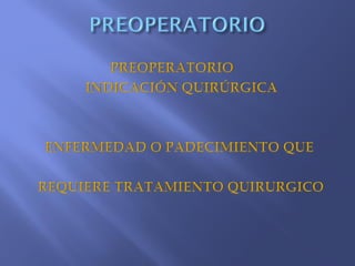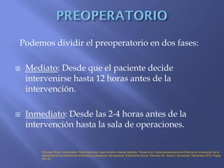 El documento divide el preoperatorio en dos fases: la fase mediata desde que el paciente decide intervenirse hasta 12 horas antes de la intervención, y la fase inmediata desde 2-4 horas antes hasta la sala de operaciones. Examina los aspectos clave de la evaluación preoperatoria como la historia clínica, pruebas complementarias, riesgo anestésico, información y consentimiento al paciente, y medidas de preparación.
