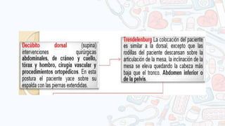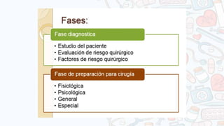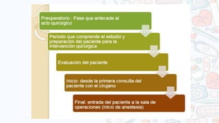 El documento detalla los cuidados y medidas de enfermería en las fases preoperatoria y postoperatoria de un paciente quirúrgico, incluyendo preparación física y emocional, control de signos vitales y prevención de complicaciones. Se describe específicamente la clasificación de los periodos pre y postoperatorios, así como las acciones generales y específicas en cada etapa. Además, se abordan las complicaciones potenciales y el manejo adecuado para asegurar la recuperación del paciente.