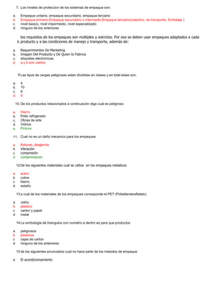 Los diferentes tipos de carga se clasifican en función de su naturaleza, como perecederos, peligrosos o dimensionales. Los empaques y envases cumplen funciones de protección, almacenamiento y transporte de los productos. Los símbolos de identificación de mercancías peligrosas incluyen llamas, calaveras y el trébol esquematizado.