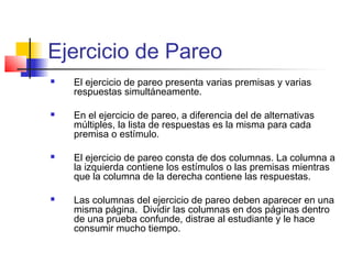 Este documento presenta diferentes tipos de ejercicios para pruebas, incluyendo pareo, cierto o falso, respuesta breve, alternativas múltiples y discusión/ensayo. Describe las características de cada tipo de ejercicio y ofrece recomendaciones sobre su construcción y uso para medir diferentes niveles de aprendizaje.