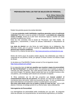 Este documento ofrece una guía sobre cómo prepararse para los exámenes de selección de personal. Explica los tres tipos principales de pruebas, incluidas las que miden habilidades cognitivas, rasgos de personalidad y comportamiento futuro. Además, proporciona consejos sobre cómo responder preguntas de manera sincera sin caer en perfiles neuróticos, caracteriales o paranoicos.