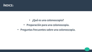 Una colonoscopia es un examen médico que utiliza un tubo flexible con cámara para explorar el colon y parte del intestino delgado. Para una colonoscopia exitosa, es importante prepararse tomando una solución laxante y siguiendo una dieta baja en fibra para vaciar los intestinos. La colonoscopia es segura pero puede haber riesgos menores como sangrado o infección. Detecta anormalidades como pólipos que podrían causar cáncer colorrectal.