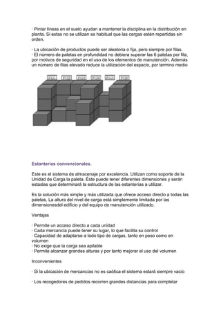 Este documento describe diferentes sistemas de almacenamiento, incluyendo el almacenamiento en bloque, estanterías convencionales, sistemas compactos, sistemas dinámicos, estanterías móviles, carruseles horizontales y verticales, y almacenes automáticos para paletas y cajas.