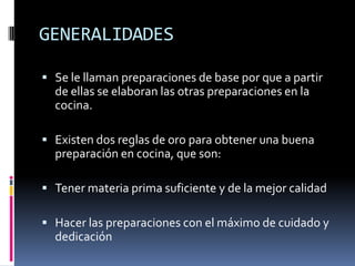 Este documento describe las preparaciones de base más utilizadas en cocina, incluyendo fondos, caldos y elementos para espesar salsas. Explica que los fondos se obtienen cociendo huesos, carcasas y verduras en agua, y los tipos principales son el fondo blanco, fondo oscuro y fondo de pescado. También describe brevemente elementos como el mirepoix, las marinadas y las salmueras que se usan para dar sabor, y métodos para espesar como el roux, beurre-manié y las yem