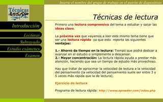 El documento ofrece consejos sobre cómo prepararse para los exámenes de forma efectiva. Recomienda planificar el estudio desde el inicio del curso para no dejar todo para el final. Además, sugiere leer de forma comprensiva y rápida, subrayar las ideas principales, realizar tres repasos espaciados en el tiempo, y seguir instrucciones al hacer el examen para aprovechar el tiempo disponible.