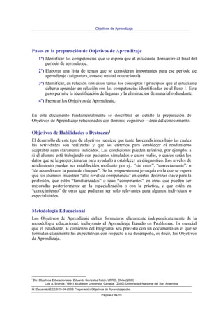 Este documento describe los objetivos de aprendizaje y cómo prepararlos de manera efectiva. Explica que los objetivos comunican lo que el estudiante debe aprender y demostrar al final de un período de aprendizaje. Detalla los pasos para preparar objetivos, incluyendo identificar competencias, conceptos, temas y luego escribir los objetivos. También describe características como ser pertinentes, claros, factibles y evaluables.