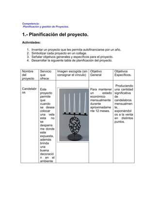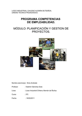 Este documento presenta un módulo sobre planificación y gestión de proyectos para un programa de competencias de empleabilidad en el Liceo Industrial Chileno Alemán de Ñuñoa. El módulo incluye actividades para que los estudiantes inventen un proyecto para autofinanciarse por un año, desarrollen un análisis FODA, planifiquen etapas del proyecto con una tabla Gantt, elaboren un presupuesto y presenten un resumen ejecutivo. El objetivo es que los estudiantes adquieran