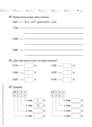 Este documento enseña sobre los números de cuatro cifras, incluyendo cómo leer y descomponer números de cuatro cifras en unidades de miles, centenas, decenas y unidades. También cubre aproximar números a la centena y al millar, sumar y restar números de cuatro cifras, números ordinales, euros y céntimos.