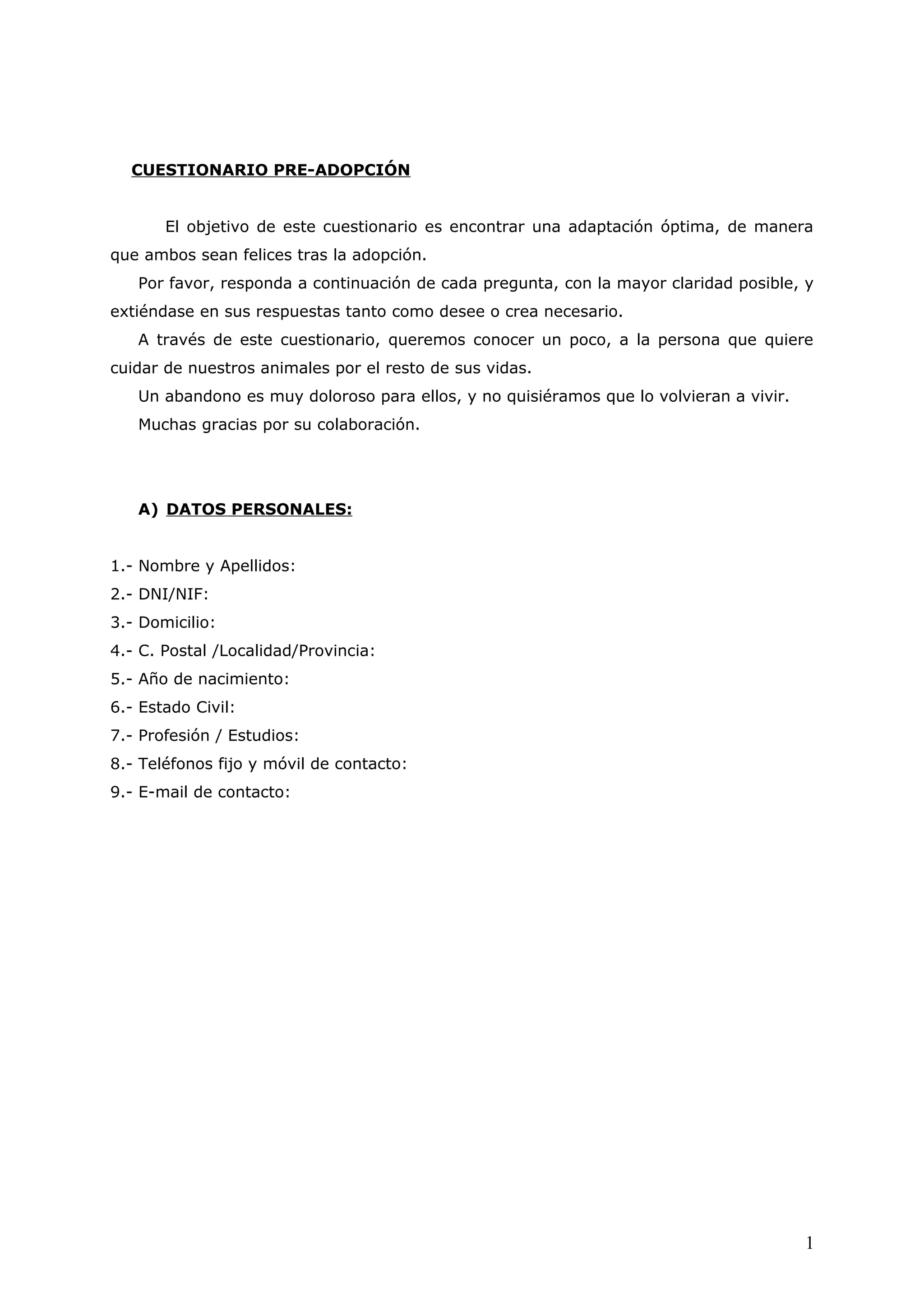 Este cuestionario pre-adopción busca encontrar el mejor hogar para un perro. Contiene preguntas sobre la vivienda, familia, estilo de vida y experiencia del solicitante con mascotas. También explora las expectativas del solicitante sobre el cuidado, entrenamiento y compromiso a largo plazo con el perro. El objetivo final es asegurar que el perro reciba un hogar amoroso y estable.