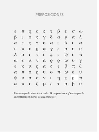 Este documento presenta un acertijo en forma de sopa de letras que contiene 14 preposiciones escondidas para que el lector las encuentre en menos de 10 minutos. El texto está compuesto por letras al azar sin significado aparente con el objetivo de ocultar las preposiciones mencionadas.
