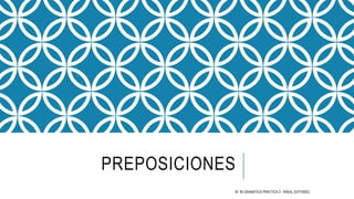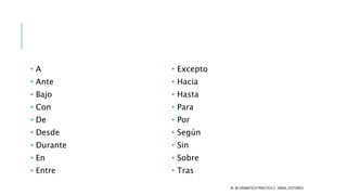 Este documento presenta una lista de preposiciones comunes en español como a, de, en, hasta, para, por y explica sus usos más frecuentes. También incluye ejemplos de cómo se usan las preposiciones para indicar complementos directos e indirectos, tiempo, lugar, finalidad, medio y parte del día. Por último, menciona algunos verbos que se usan con preposiciones como acercarse a, alegrarse de, preocuparse por.