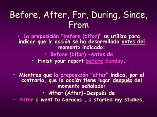 El documento describe varias preposiciones en inglés utilizadas para indicar tiempo, lugar y movimiento. Explica preposiciones como "before", "after", "for", "during", "since", "from", y preposiciones de lugar como "in", "on", "at", así como ejemplos de su uso.