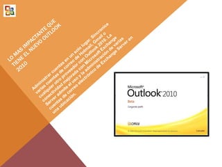 El documento describe las principales características y mejoras de Microsoft Outlook 2010. Outlook 2010 ofrece herramientas avanzadas para administrar el correo electrónico, calendario y tareas de forma más efectiva. Las mejoras incluyen un nuevo diseño, búsqueda mejorada, comunicaciones sociales y funciones mejoradas para organizar el correo electrónico, calendario y tareas. Outlook 2010 ayuda a los usuarios a mantenerse productivos y en contacto con sus redes personales y de negocios.