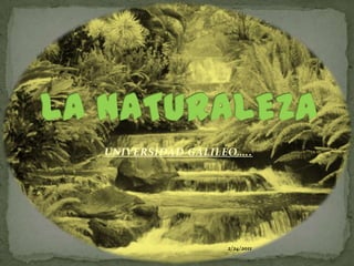 El documento define la naturaleza como el mundo físico y la vida en general. Explica que las variaciones del tiempo atmosférico redistribuyen el calor a través de corrientes oceánicas y atmosféricas. También describe algunas amenazas a la naturaleza como la contaminación, la deforestación y desastres como derrames de petróleo, así como formas de protegerla.