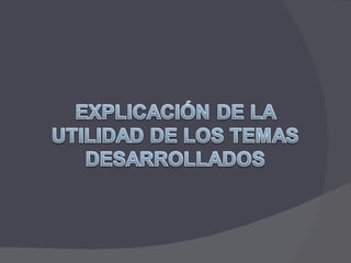 Este documento presenta una serie de temas relacionados con informática como buscar sitios de hosting para páginas web, los pasos para publicar una página web, cómo combinar archivos de Word, Excel y Access, conceptos sobre virus de computadora, cómo crear un blog, y los pasos para crear un video en Movie Maker. El documento incluye presentaciones sobre estos temas con el objetivo de enseñar estas herramientas y conceptos a los estudiantes.