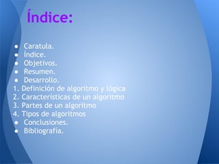 Este documento explica conceptos fundamentales de algoritmos y lógica de programación. Define algoritmo como un procedimiento seguro para lograr un resultado, e identifica sus características como finito, definido, general y neutral de materia. Explica que un algoritmo tiene partes como entrada, proceso y salida. Finalmente, distingue entre algoritmos cualitativos y cuantitativos.