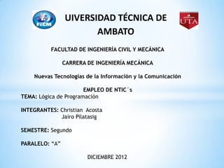 Este documento habla sobre algoritmos y lógica de programación. Define algoritmo como un procedimiento mecánico para lograr un resultado y describe sus características como ser finito, tener inicio y fin, y poder ser realizado en diferentes materiales. Explica partes de un algoritmo como entrada, proceso y salida. También cubre pasos para resolver problemas por computadora como análisis, diseño, codificación, compilación, depuración, documentación y ejecución.