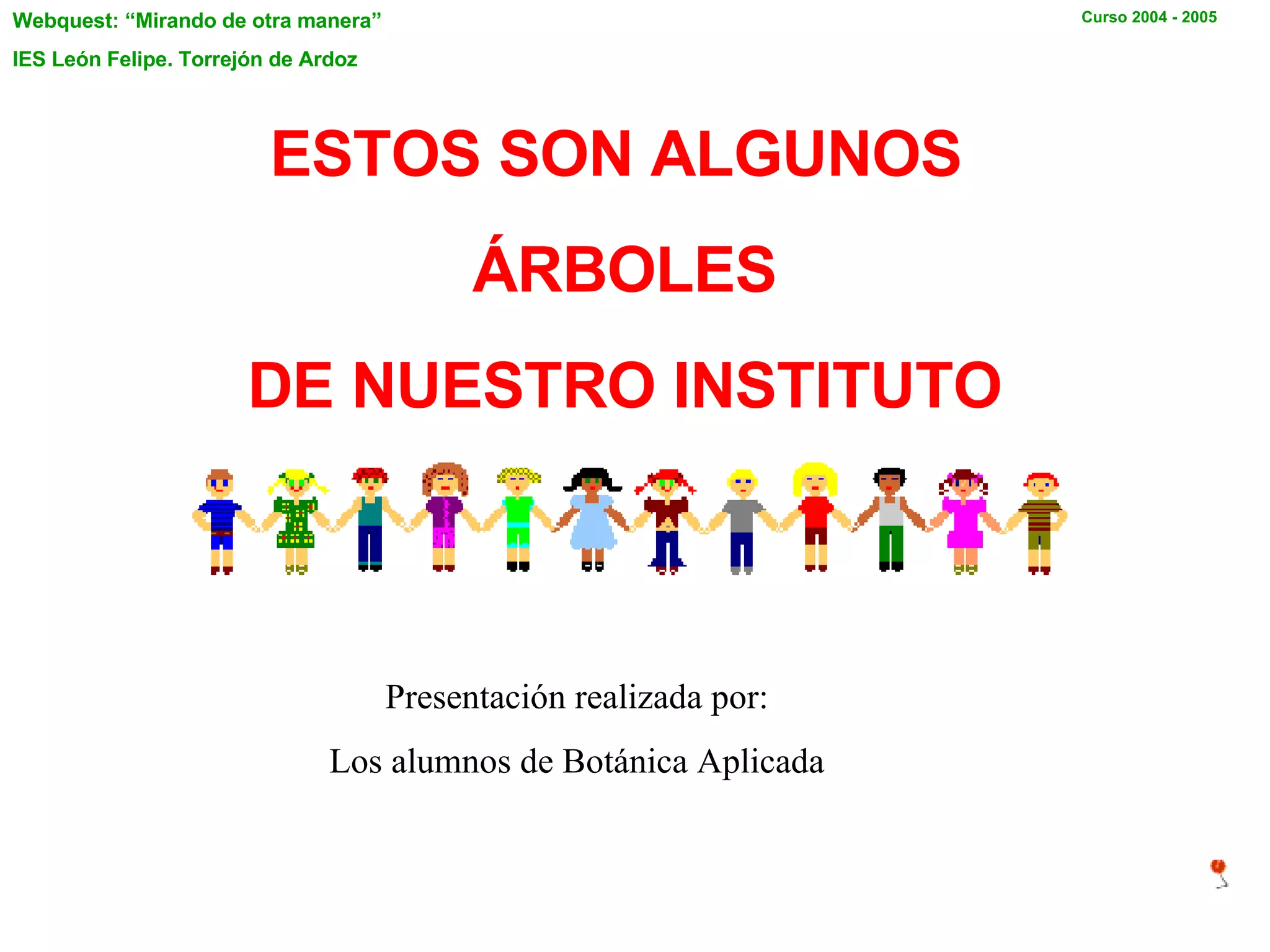 El resumen presenta una breve descripción de varios árboles encontrados en un instituto, incluyendo su nombre científico, familia, origen y características principales. Entre los árboles descritos se encuentran la mimosa, el nogal, el manzano y el olivo.