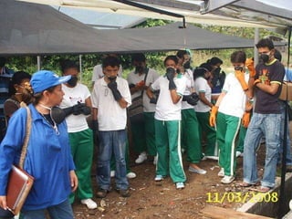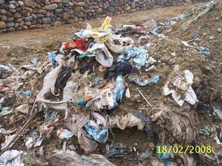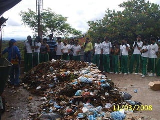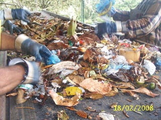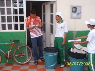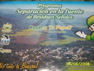 El documento presenta información sobre la producción mundial de residuos sólidos, el tiempo de degradación de diferentes materiales, la producción y disposición de residuos en el municipio de Palermo en Colombia. Propone un proyecto para crear conciencia sobre la separación de residuos en la fuente a través de campañas educativas, con el objetivo de recuperar material reciclable y minimizar los impactos ambientales negativos de los desechos.