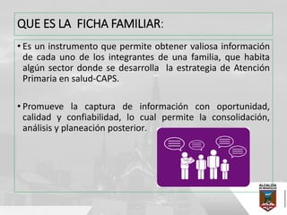 La ficha familiar es un instrumento para recoger información sobre los miembros de una familia y sus condiciones de salud, facilitando el análisis y la planificación en la atención primaria en salud. Su objetivo incluye la identificación de factores de riesgo y condiciones generales relacionadas con el acceso y adherencia al tratamiento. Se enfatiza la importancia de un enfoque ético y profesional en la recolección de datos, garantizando el respeto y la confidencialidad de la información brindada por las familias.