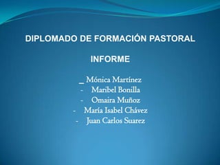 El documento presenta un informe sobre un diplomado de formación pastoral. Se discuten temas como el trabajo, la importancia del género femenino, y el caso de una mujer llamada Marina. Se analiza el tema a la luz del Evangelio y se proponen soluciones como grupos de trabajo solidario y ampliar los cursos de formación a más comunidades.