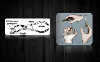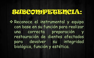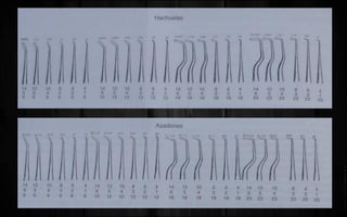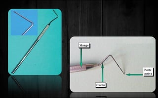 Este documento clasifica y describe los diferentes tipos de instrumental utilizado en odontología. Explica que el instrumental se divide en tres categorías: activo, complementario y para restauración. Detalla cada categoría y subcategoría, describiendo los tipos específicos de instrumentos incluidos y sus funciones. También discute los materiales utilizados, formas de clasificar los instrumentos, y los efectos de los instrumentos activos en los tejidos dentales.