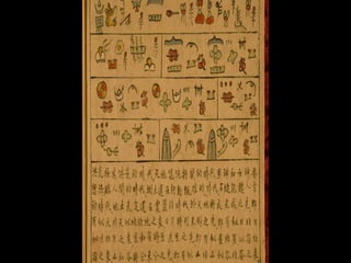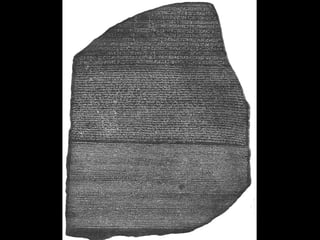 El documento habla sobre los orígenes de la escritura. Menciona que la escritura surgió hace aproximadamente 6,000 años y que en ese momento todavía no era de uso universal, con aproximadamente la mitad de la población humana sin usarla. También menciona varios sistemas de escritura antiguos como el jeroglífico, hierático, demótico, griego, cuneiforme, sumerio, arcadio, ugarítico, persa, cananeo, arameo, etíope, judaico, hebreo y si