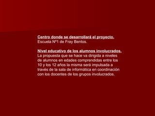 Este documento presenta un proyecto educativo llamado "Educar para la imagen a través del cine" que se llevará a cabo en una escuela primaria en Fray Bentos, Uruguay. El proyecto involucra a estudiantes de 10 a 12 años y se desarrollará durante todo el año escolar. Los objetivos incluyen enseñar sobre medios audiovisuales, análisis crítico de películas y mensajes, y producción de videos cortos. El proyecto consta de tres etapas: motivación, investigación y ej