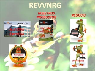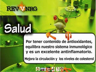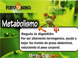 Este documento describe un producto llamado REVVNRG, que es una fórmula compuesta por extractos de plantas sudamericanas como copoazú, açaí, cha de bugre, algas, uva, galangal, stevia, yerba mate, té verde y canela. Explica los beneficios de cada ingrediente para la salud y el metabolismo. También describe las formas de ganar dinero a través de la venta del producto y testimonios de usuarios sobre los resultados obtenidos.