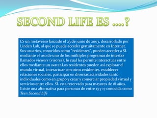 Second Life es un metaverso lanzado en 2003 donde los usuarios pueden interactuar a través de avatares, explorar el mundo virtual, comprar y vender bienes y servicios usando la moneda Linden Dólar. Los usuarios también pueden crear y personalizar objetos, escenas y scripts. Segundo Life ha sido adoptado por algunas empresas, organizaciones religiosas y políticos para promover sus marcas y mensajes.