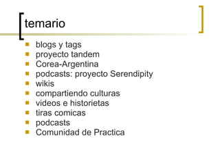 El documento describe cómo Internet puede promover la interacción entre estudiantes a través de herramientas como blogs, podcasts, wikis y comunidades de práctica. Se detallan varios proyectos realizados entre 2006-2007 que involucraron a estudiantes de Argentina y Estados Unidos para compartir culturas a través de estas herramientas en un entorno bilingüe y multicultural.