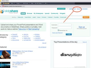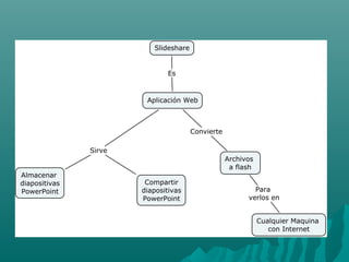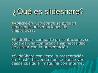 SlideShare es una aplicación web donde se pueden almacenar y compartir presentaciones de diapositivas en formato Flash para poder verlas desde cualquier máquina con Internet. Para unirse a SlideShare, se debe llenar un formulario con los datos personales en la página web, escribir un código de verificación, aceptar los términos y condiciones, y hacer clic en registrarse. Una vez registrado, se puede subir una presentación seleccionando el archivo en la computadora y completando algunos metadatos para su localización dentro del sistema.