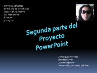 Este documento presenta tres presentaciones de PowerPoint realizadas como parte de un proyecto de seminario de informática. La primera presentación explica cómo publicar una página web y cómo insertar archivos como flash, video y gráficos de Excel en PowerPoint. La segunda presentación describe conceptos como blogs, spam, phishing y malware. La tercera presentación detalla la creación de un blog personal. El propósito del proyecto es proporcionar conocimientos sobre publicación web y amenazas cibernéticas.