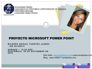 Este documento presenta un proyecto elaborado en PowerPoint 2007 sobre temas de interés para el ejecutivo y para personas que desean innovar y ampliar su conocimiento sobre herramientas tecnológicas. El proyecto incluye secciones sobre el uso de Outlook como herramienta administrativa, características y beneficios de Windows 7 y Office 2007, medios de pago electrónicos, y conclusiones sobre la importancia del conocimiento tecnológico para el desarrollo personal y laboral.