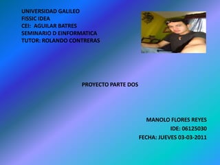 Este documento presenta un proyecto en dos partes sobre temas de informática. La primera parte explica los pasos para buscar sitios web gratuitos de hospedaje y publicar una página web utilizando secuencias gráficas en PowerPoint 2007. La segunda parte incluirá definiciones de términos como spam y phishing, así como instrucciones para crear un blog y video en Movie Maker. El autor concluye que completar este tipo de proyectos mejora las habilidades para presentaciones profesionales utilizando programas de computadora.