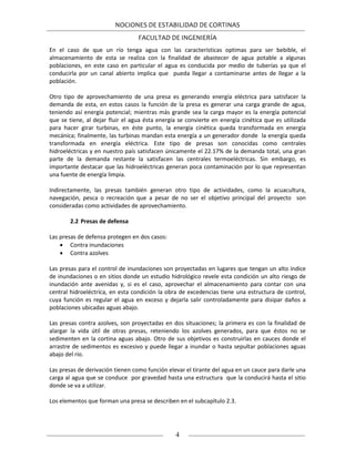 El documento describe los diferentes tipos de presas, incluyendo presas de aprovechamiento como presas de riego y presas hidroeléctricas, y presas de defensa como presas contra inundaciones y contra azolves. También describe los estudios previos necesarios para la planificación de una presa, como estudios topográficos, geológicos, hidrológicos y un análisis costo-beneficio.