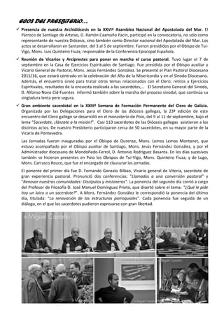 En su homilía, el Papa Francisco destacó la importancia de la gratitud y la laboriosidad en la vida espiritual de los sacerdotes y consagrados, instándolos a ser testigos de la alegría de su vocación y a vivir un estilo de vida de intenso trabajo. Subrayó los peligros de medir el éxito según criterios mundanos y la necesidad de acercarse a los pobres para entender un descanso más generoso y cristiano. Además, se mencionaron actividades recientes en la diócesis, incluyendo jornadas de formación y el inicio del curso pastoral, con énfasis en la renovación y el servicio a la comunidad.