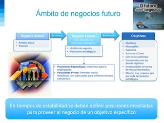 El documento aborda la formulación e implementación de estrategias en el ámbito empresarial, enfatizando la importancia de definir objetivos estratégicos claros y medibles. Se discuten metodologías para la creación de estructuras organizacionales que apoyen estas estrategias y la necesidad de gestionar la innovación a lo largo de las diferentes etapas del ciclo de vida de una empresa. Además, se resalta el papel de la gobernabilidad en la toma de decisiones y la alineación de iniciativas con los objetivos organizacionales.
