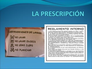 Este documento describe los textos prescriptivos, que tienen la función de regular o guiar el comportamiento del receptor. Existen dos tipos principales: los textos normativos, que establecen normas y reglas; y los textos instructivos, que proveen instrucciones para completar una tarea en pasos secuenciales. Generalmente, los textos prescriptivos tienen una estructura con una meta y un programa de instrucciones o normas para alcanzarla. El lenguaje usado debe ser claro, preciso y sencillo, usando marcadores de orden y verbos en imperativo o infinit