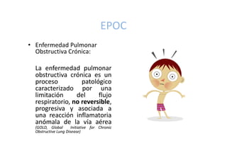 El documento describe los beneficios del ejercicio físico para pacientes con EPOC. La EPOC causa disfunción respiratoria y muscular. El ejercicio mejora la tolerancia al ejercicio, reduce la disnea y fatiga, y fortalece la musculatura respiratoria débil. Los programas de ejercicio deben ser individualizados y basados en la funcionalidad del paciente.