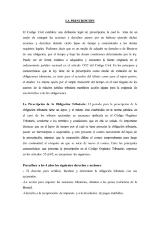 El documento describe los principios y características de la prescripción en el derecho tributario según el Código Civil y el Código Orgánico Tributario. La prescripción es un medio para extinguir obligaciones tributarias si no se ejercen los derechos durante cierto tiempo. Las obligaciones tributarias prescriben a los 4 años generalmente, pero pueden ser interrumpidas o suspendidas. La prescripción opera por el transcurso del tiempo sin acciones de los sujetos de la relación jurídica tributaria.