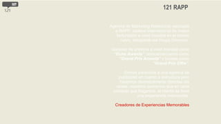 121 Rapp es una agencia de marketing relacional asociada a RAPP, una cadena internacional líder en el rubro. Ofrece una variedad de servicios de marketing y publicidad como creatividad, producción audiovisual, fotografía, ilustración digital, impresión, web y multimedia, merchandising, implementación de campañas y más. Su enfoque es crear experiencias memorables para los clientes a través de ideas innovadoras y su implementación efectiva.