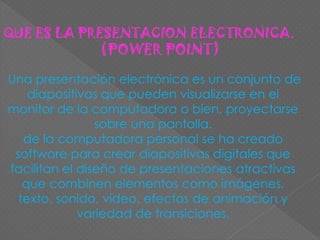 Este documento describe las presentaciones electrónicas (PowerPoint), sus ventajas y desventajas. Una presentación electrónica consiste en diapositivas que se pueden visualizar en una computadora o proyectar. PowerPoint facilita el diseño de presentaciones atractivas con elementos como imágenes, texto, sonido y video. Ventajas incluyen guías de diseño, mejorar presentaciones con medios, complementar información con gráficos y editar datos fácilmente. Desventajas son requerir un proyector y computadora portátil para transportar la presentación
