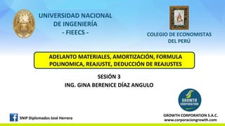 El documento habla sobre adelantos de materiales, amortización de adelantos, fórmulas polinómicas y reajustes. Explica que el contratista puede solicitar adelantos para materiales e insumos siempre que se haya iniciado el plazo de ejecución contractual y que la solicitud se efectúe de acuerdo con el calendario presentado. También describe cómo se calcula la amortización de adelantos directos y de materiales, así como el uso de índices unificados de precios y fórmulas pol