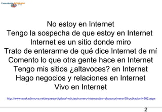 El documento aborda la importancia de la presencia en Internet y cómo los usuarios se han convertido en los protagonistas de esta nueva era digital, destacando la evolución de la web desde 1.0 a 2.0 y la explosión de las redes sociales. También se enfatiza la clave de la conversación en línea, la creación de contenido valioso y la participación activa de los usuarios en comunidades para fomentar una relación cercana y significativa con las marcas. Finalmente, se menciona la flexibilidad que deben tener las organizaciones respecto a la propiedad intelectual y la necesidad de herramientas adecuadas para enriquecer la experiencia de los usuarios.