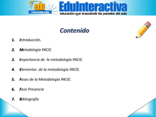 Este documento describe la metodología PACIE, creada para incluir las TIC en la educación de una manera organizada. La metodología PACIE consta de cinco fases (Presencia, Alcance, Capacitación, Interacción y E-Learning) que guían el uso efectivo de herramientas virtuales como aulas virtuales y la web 2.0 en la enseñanza. La metodología enfatiza al docente como figura principal del aprendizaje y busca desarrollar procesos tecno-educativos de forma gradual para evitar