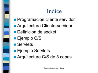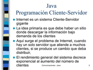 Este documento trata sobre la programación cliente-servidor en Java. Explica conceptos como la arquitectura cliente-servidor, sockets, ejemplos de código cliente-servidor, servlets y la arquitectura de tres capas. También introduce conceptos como thin clients y el uso de JDBC para conectarse a bases de datos desde aplicaciones Java.