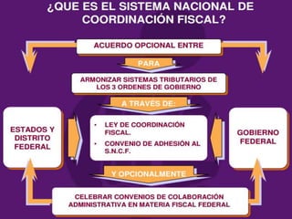 El Sistema Nacional de Coordinación Fiscal (SNCF) establece la coordinación entre la federación y los estados para el cobro de impuestos y la distribución de recursos. El SNCF incluye fondos de participaciones para los estados y municipios calculados según criterios como población, eficiencia recaudatoria e ingresos por petróleo, así como fondos de aportaciones para servicios como educación, salud e infraestructura. El SNCF es supervisado por organismos como la Junta de Coordinación Fiscal y el Instituto para el Desarrol